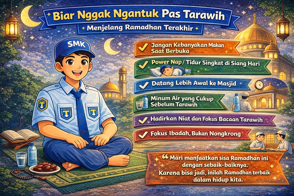 Bulan Ramadhan hampir memasuki penghujungnya. Pada fase inilah umat Muslim dianjurkan untuk semakin meningkatkan ibadah, termasuk melaksanakan shalat tarawih dengan lebih khusyuk. Namun tidak sedikit pelajar yang merasa mengantuk atau kurang fokus saat mengikuti tarawih di malam hari. Agar ibadah tetap maksimal, ada beberapa tips sederhana yang bisa dilakukan oleh para pelajar, khususnya siswa SMK, […]